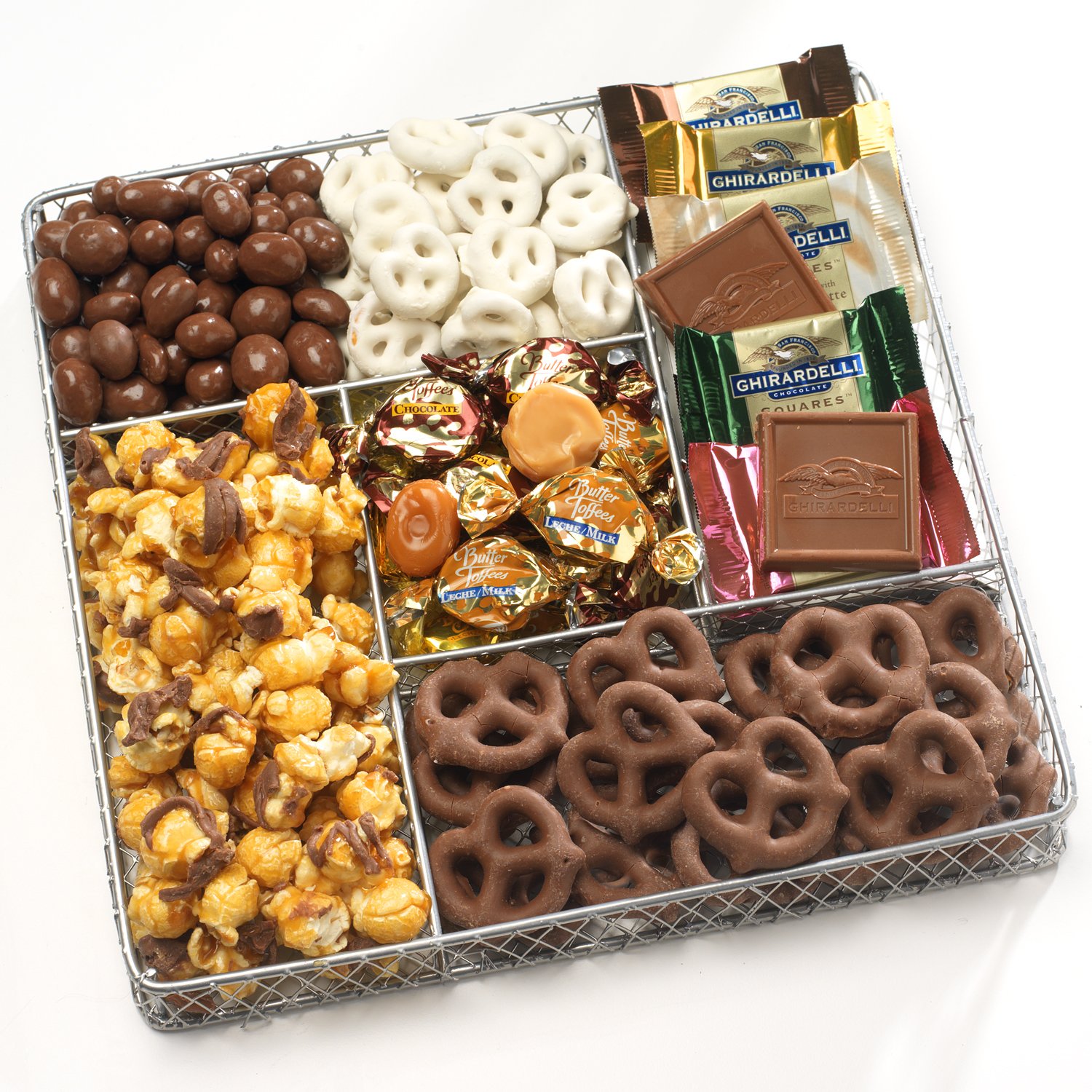- Gift basket is filled with an assortment of gourmet snacks: chocolate enrobed nuts, yogurt pretzels, chocolate drizzled caramel popcorn, pretzels smothered in chocolate, assorted Ghirardelli chocolate squares and assorted sweets